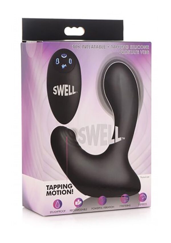 Inflatable and Tapping Prostate Vibe with Remote ControlVergroot je genot met deze opblazende, trillende en tikkende prostaatvibrator! Dit premium prostaatspeeltje combineert drie intense sensaties voor een nieuwe wereld van prostaatstimulatie – de inbrengbare steel zwelt zachtjes in je op en rekt je binnenkant uit voor een gevoel van volheid terwijl de vibratie zijn magie op je p-spot doet. De opblazende punt is perfect voor mannen die hun grenzen willen testen met meer controle – gebruik de bedieningselementen aan boord of de meegeleverde draadloze controller om de punt op te blazen en leeg te laten lopen op verzoek en ontdek welk vulniveau voor jou werkt! Trakteer je smet ondertussen op de tikkende beweging op de andere steel! Het ritmische tikken masseert het gebied tussen je ballenzak en je anus, waardoor je orgasme wordt verheven tot een full-body ervaring. Gemaakt van premium, ftalaatvrije en lichaamsveilige siliconen die fluweelzacht zijn en gemakkelijk schoon te maken voor en na gebruik. USB-oplaadbaar met meegeleverde kabel. Draadloze controller gevoed via 2 AAA-batterijen, niet inbegrepen. Afmetingen: Totale lengte 5,6 inch, breedste diameter 1,5 inch, inbrengbare lengte 3,9 inch, zwelt op tot 2 inch Materialen: Siliconen Kleur: Zwart Belangrijkste kenmerken: Opblazen en vibreren: Ontworpen om op te blazen met één druk op de knop, waardoor de plug uitbreidt van 1,5 inch tot 2 inch dik, perfect om je anale en prostaatspelgrenzen te verkennen met comfort en controle Taint Tapping Fun: Het tikkussen op de perineumstimulator tikt en pulseert op je taint, gecombineerd met de krachtige vibraties om je orgasmes naar nieuwe hoogten te tillen Draadloze controller inbegrepen: Blader door 7 patronen en 3 intensiteiten van anale vibraties en taint tapping met één druk op de knop, perfect voor koppels of solospel Oplaadbaar en spatwaterdicht: Oplaadbaar via USB met meegeleverde oplaadkabel Het spatwaterdichte ontwerp maakt deze Swell-plug gemakkelijk schoon te maken voor en na gebruik