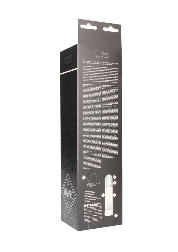 | omschrijving beslist | Automatic Luv Penis Pump Automatic Luv Penis Pump Met een totale cilinderlengte van 20 cm (7,8) en een diameter van 6 cm (2,36), biedt deze hoogwaardige pomp meer dan voldoende mogelijkheden om te groeien, zowel in lengte als in omtrek! De cilinder is gemaakt van zachte en flexibele silicone. U zal telkens weer verbaasd staan als u ziet hoe het groeit. Wanneer u op de knop drukt creeert deze zeer sterke pomp een supersterk vacuum, voor een snelle en krachtige erectie. De zachte siliconen opening zorgt voor een strakke maar comfortabele afdichting. Werkt met 2 AA batterijen.rWAARSCHUWING:Lees de producthandleiding voordat u een vacuumpomp ofcockring gebruikt.Stop onmiddellijk met het gebruik van de apparaten als u pijn of ongemak ervaart. |