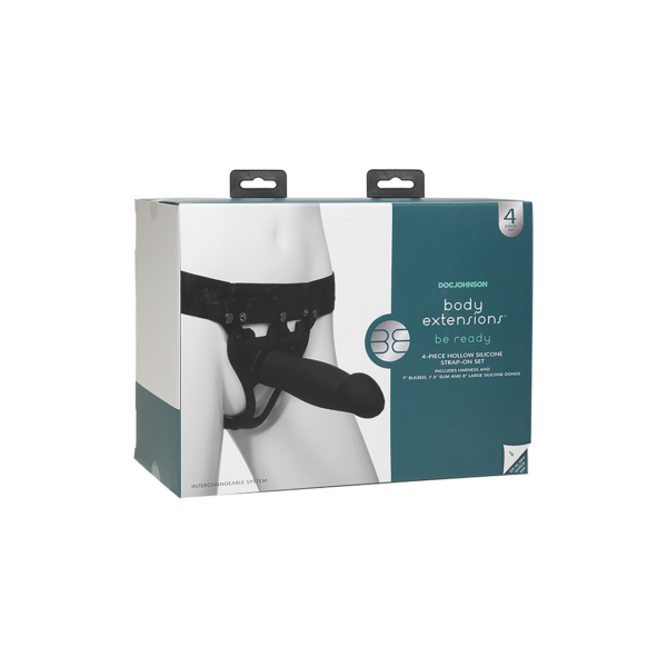 Ready – Silicone HarnessWEES alles wat je wilt zijn. Het Body Extensions Hollow Strap-On System van Doc Johnson is een unisex-collectie van harnassen en holle siliconen hulpstukken die zijn ontworpen om het lichaam te stimuleren en penetratie mogelijk te maken, ongeacht het type of de functie van de anatomie van de drager. Deze hoogwaardige 4-delige set bevat een elastisch en eersteklas siliconen harnas ontworpen voor maximaal comfort en duurzaamheid en drie eersteklas siliconen opzetstukken die zijn gemaakt om het seksuele plezier en de empowerment van elke gebruiker te maximaliseren. Elk product in de Body Extensions-collectie bevat gedetailleerde instructies voor verzorging en gebruik.