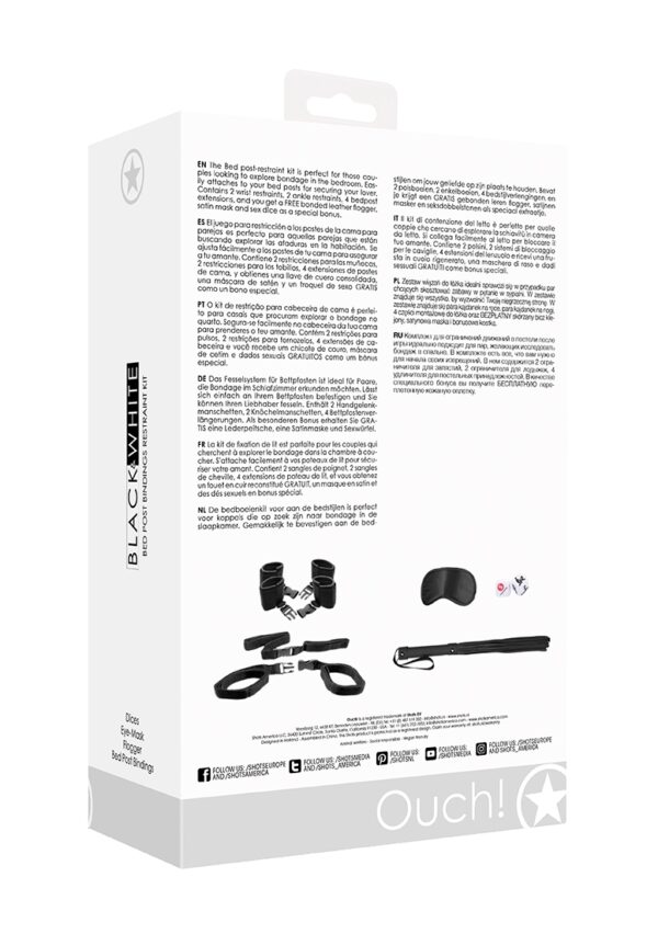 Bed Post Bindings Restraint KitDe bedboeienkit voor aan de bedstijlen is per- fect voor koppels die op zoek zijn naar bondage in de slaapkamer. Gemakkelijk te bevestigen aan de bedstijlen om jouw geliefde op zijn plaats te houden. De kit heeft alles wat je nodig hebt om je kinky kant te ontdekken. Bevat 2 polsboeien, 2 enkelboeien, 4 bedstijlverlengingen, en je krijgt een GRATIS leren flog- ger, satijnen masker en seksdobbelstenen als speciaal extraatje.