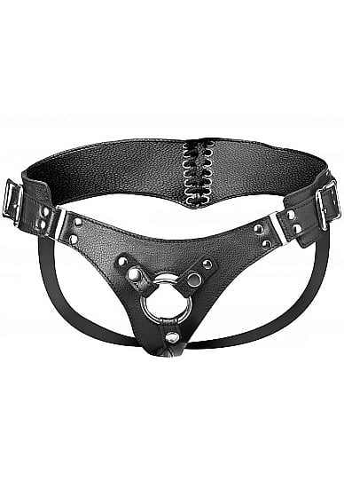 Bodice – Corset Style Strap-On HarnessDeze verleidelijke korset terug dildo harness ziet er absoluut prachtig uit op bijna elk lichaamstype! Met verstelbare gespen op de heupen, verschuifbare D-ringgespen op de billen en een vetersluiting in korsetstijl aan de achterkant, kun je jouw ideale pasvorm vinden. De korsetrug buigt en buigt om je lichaam, waardoor een onweerstaanbare hartvorm ontstaat. Het materiaal is veganistisch en ongelooflijk comfortabel, met een realistische leerachtige look. De voorkant heeft een open gat met drie klikriemen die de metalen O-ring ondersteunen.