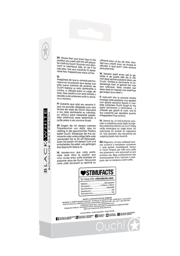 Silky Bondage RibbonVerzeker jezelf ervan dat je geliefde in de positie blijft die je wilt, met deze zijde doek van Ouch!. Ontdek je dominante of onderdanige kant, of gebruik het voor een rollenspel. Wees creatief met deze doek en bepaal voor jezelf hoe gevangen jouw slaaf is.De Silky Ribbon is 167cm lang en 6cm breed.