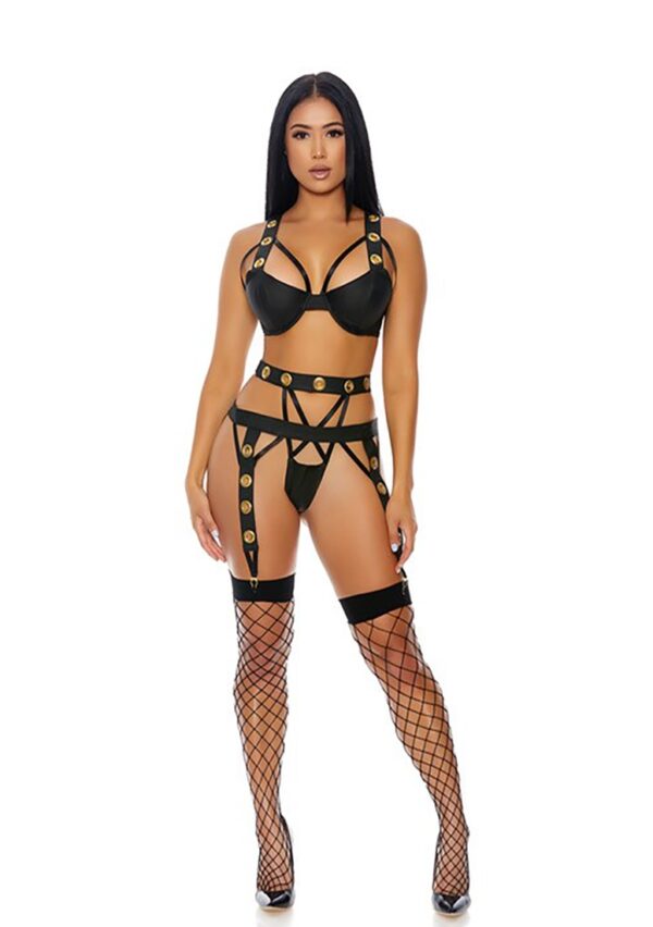 Caged Babe – Lingerie Set – XL3-delig lingeriesetje met bandjes, een bh met grommetdetails, gecombineerd met een bijpassend hoog getailleerde panty met uitsparing en kousenband.