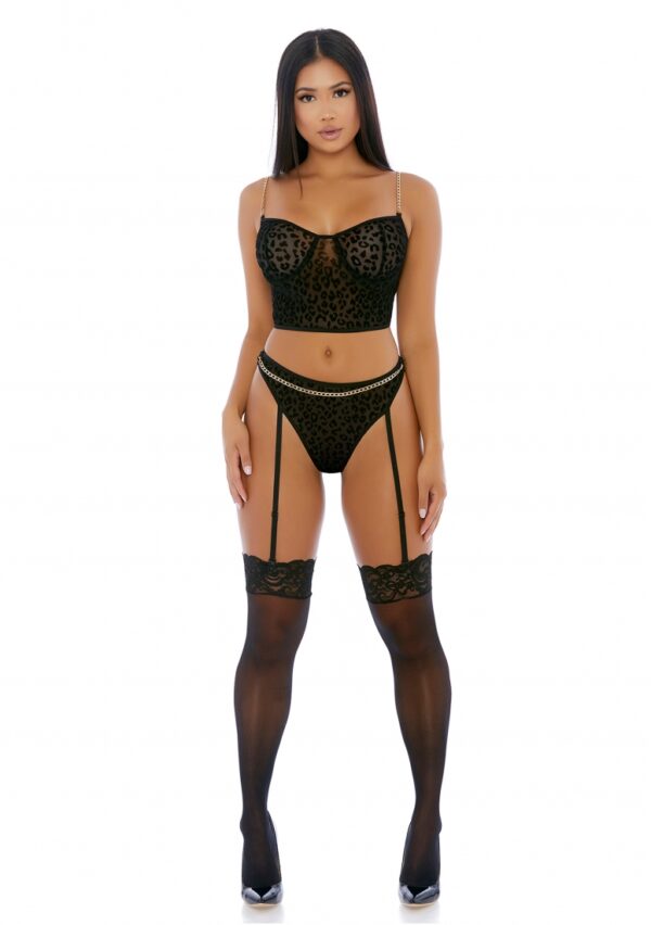 Chain Me Up – Bustier Set – MChain Me Up tweedelige bustierset van cheetah-mesh, verstelbare bandjes met gouden ketting, haak- en oogsluiting aan de achterkant