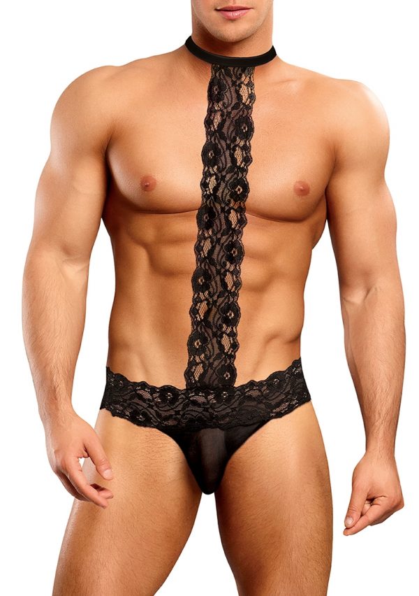Choker Thong – L/XL – BlackDeze stijl komt uit de Scandal-Lace-collectie van Male Power en omvat: Een choker-string met een gaaszakje, een micro-string aan de achterkant en een dikke gebloemde kanten tailleband met een vastgemaakt T-bandje aan de voorkant, bevestigd aan een cire-choker met klittenband.
