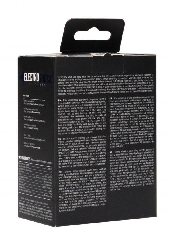 Geef wat pit aan uw seksspel met deze gloednieuwe lijn ELECTROSHOCK speeltjes!Door middel van elektrische stroom om zenuweinden in erogene zones te stimuleren tilt deze vibrerende penisring beide orgasmes naar een geheel nieuw niveau.Door zich te richten op de meest intieme gebieden en door het toevoegen van elektriciteit in het bijzonder erotische elektrostimulatie zal dit high-tech seksspeeltje schokgolven door de slaapkamer sturen wat voor een hoop vuurwerk tussen de lakens zal zorgen!Deze schokkend goede ring wordt geleverd met 2 onafhankelijke instellingen vibratie en elektrostimulatie die ook gelijktijdig kunnen worden gebruikt. De vibratiemodus wordt geleverd met 7 verschillende pulserende patronen en toeren tot 8500 omw/min. bij minder dan 60dB. De elektrostimulatiemodus heeft 2 intensiteitsniveaus laag en hoog. In de elektrostimulatiemodus wordt de clitoris gestimuleerd wanneer beide metalen strips de huid raken. Het gestippelde lipje aan de onderkant van de ring stimuleert ook het perineum.De ring is gemaakt van ftalaatvrije hoogwaardige siliconen en ABS. De binnendiameter van deze penisring is 3 cm (119) maar de hoge flexibiliteit zal ervoor zorgen dat hij voor bijna alle maten past.De meegeleverde USB-kabel laadt het speelgoed in ongeveer 60 minuten op en geeft u 90 minuten ongebreideld plezier!Het beoefenen van elektroseks met ELECTROSHOCK vereist voorzichtigheid. Beperk het elektrosekspel tot onder het middel! Deze speeltjes NIET gebruiken in combinatie met water!
