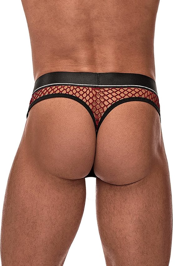 Cock Ring Thong – L/XL – BurgundyDeze stijl komt uit de Cock Pit Net-collectie van Male Power en bestaat uit: een cockringstring met een afneembaar zakje dat los kan worden geklikt en een zachte elastische C-ring laat zien, een klassieke string aan de achterkant, zachte elastische afwerking en een satijnen tailleband met merklogo.