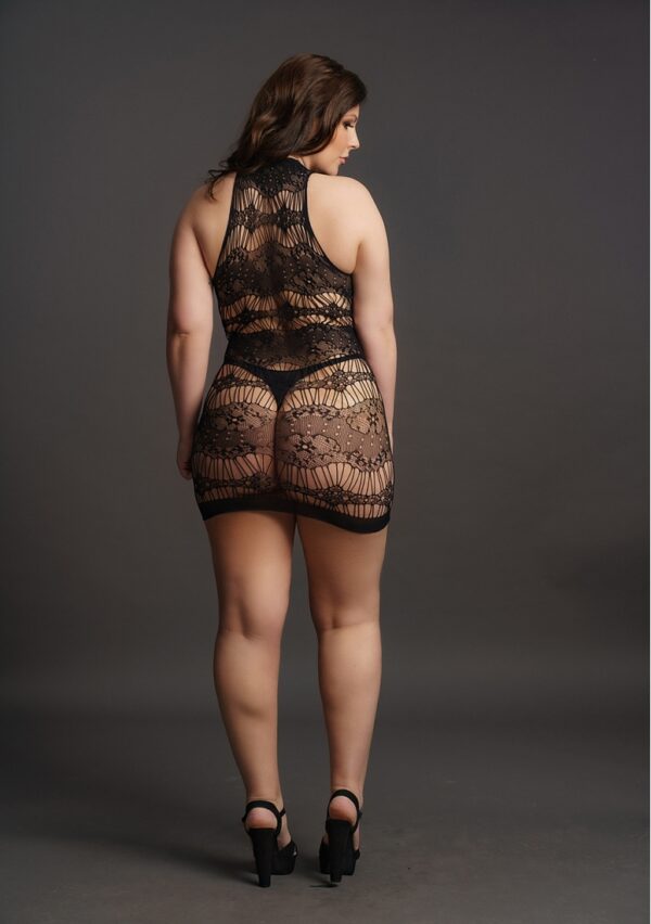 Criss Cross Neck Mini Dress – Plus SizeEen mini-jurkje met kantpantroon en een sexy halslijn met opengewerkte details. De zachte, superelastische stof is geschikt voor maten XL tot 4XL.String niet inbegrepen.