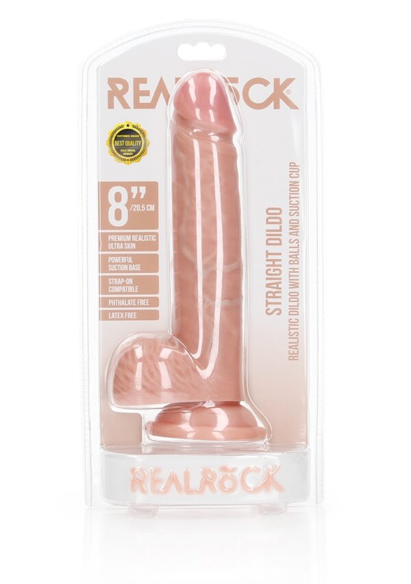 Straight Realistic Dildo with Balls and Suction Cup – 8 / 20,5 cmRealRock is ontworpen voor jouw ultieme genot. Een stevige en zacht aanvoelende dildo, met een