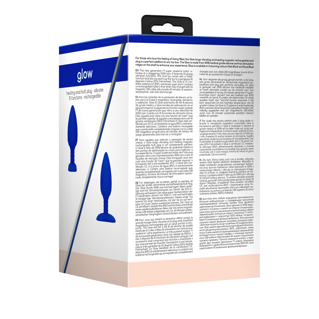 Glow – Heating Anal Butt Plug – For those who love the feeling of being filled, the Glow large vibrating and heating magnetic rechargeable butt plug is a perfect addition to any toy box. The Glow is made from 100% medical grade silicone and has stimulation ridges on the shaft to enhance your experience. Glow is available in 3 stunning colours: Red, Black and Royal Blue! This new generation F1 super powerful motor vibrates at a staggering 11,000 rpm. It features 10 unique vibration functions. This anal toy comes with a �heat function that lets you warm up the toy to a gorgeous 42 degrees Celsius (107.6 Fahrenheit). The Glow is CE Certified, waterproof (IP67), extremely quiet and it contains a rechargeable battery that when fully charged with its magnetic USB cable will provide 60 minutes of passionate playtime. Just click and charg