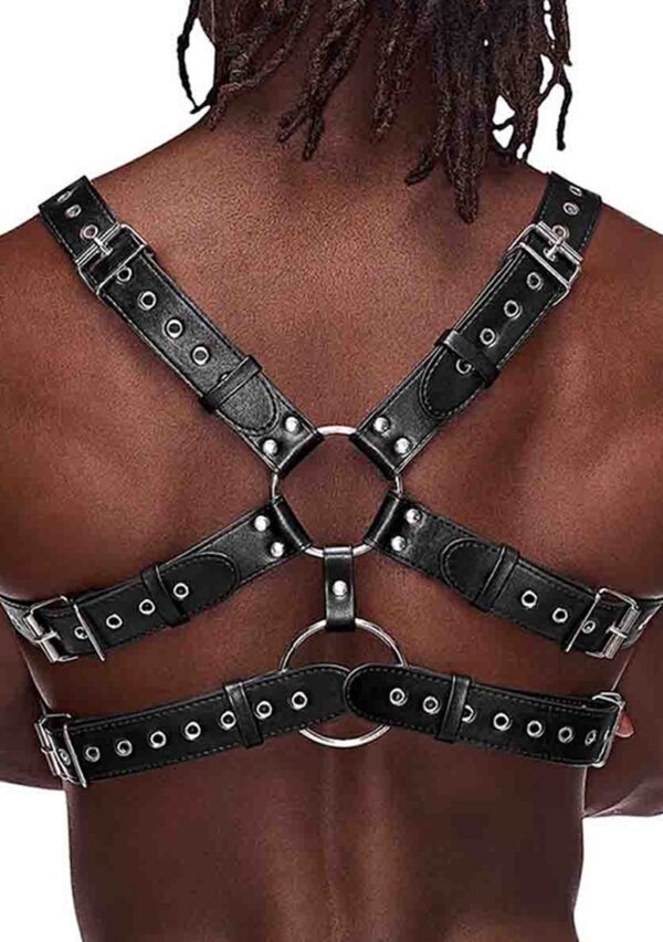 Gemini – Imitation Leather Harness – One Size – BlackDeze stijl uit de Leather-collectie van Male Power bestaat uit: een harnas met dubbele banden en metalen ri