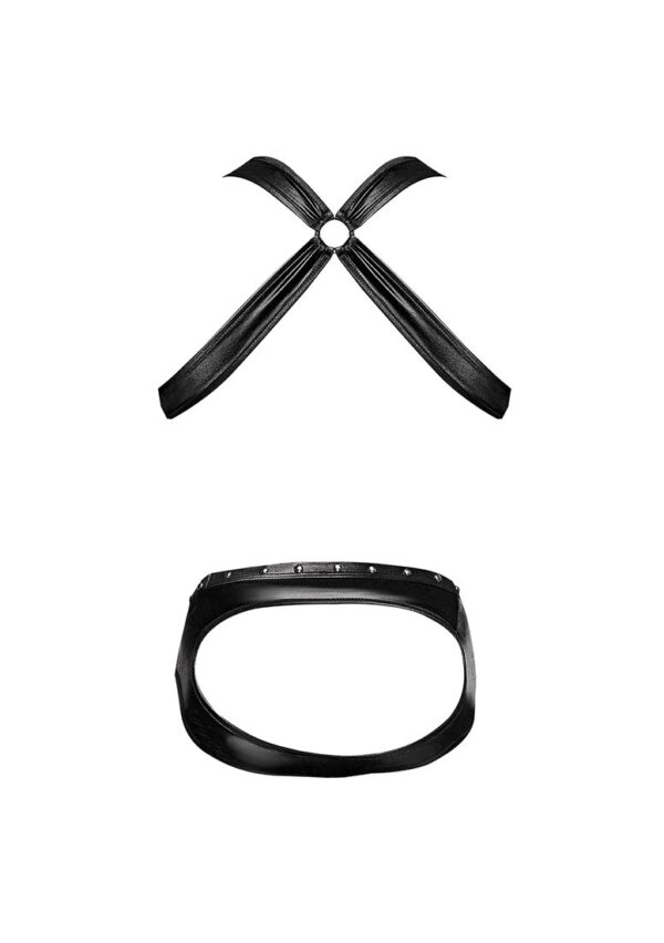 Uranus – Harness Style Open Back Jock Briefs with Suspender Straps – L/XL – BlackDeze stijl komt uit de Fetish-collectie van Male Power en bestaat uit: een jockstrap met jarretelbandjes, een harnasachtige achterkant, een uitsparing aan de achterkant en bevestigde metalen ringen en decoratieve studs.