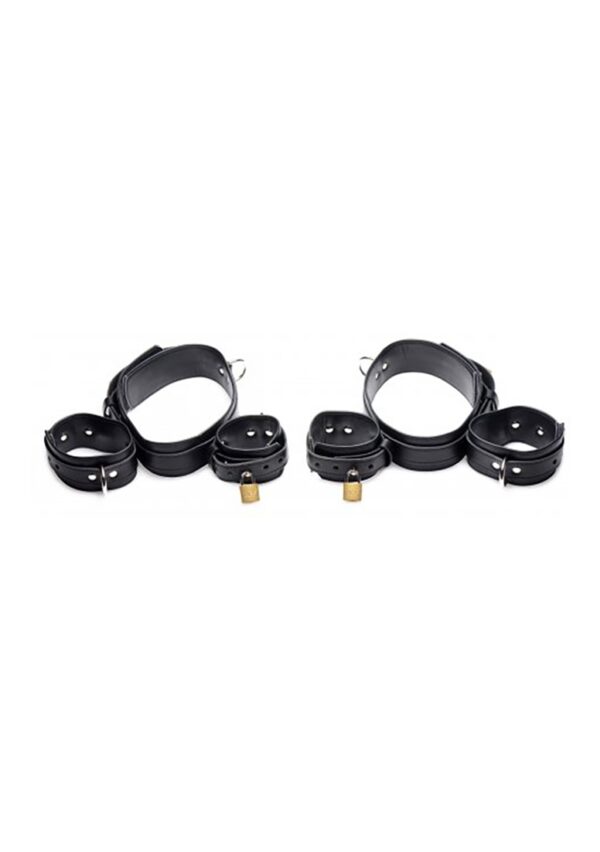 Frog Tie Binding SetSluit de enkels, polsen en dijen van je geliefde aan elkaar om ze op hun knieën te krijgen en hun lichaam te openen voor jouw grillen. Duurzaam en comfortabel, geschikt voor alle niveaus van BDSM-spelers om de opwindende wereld van bondage en onderwerping te verkennen! Verstelbaar om de perfecte pasvorm te vinden en bevat alle sloten en sleutels die je nodig hebt om optimaal van deze Frog Tie-set te genieten. Sluit je partner op met de duurzame vergrendelende gespen – deze Frog Tie-beperkingsset bevat 6 sloten en 12 sleutels om je geliefde vast te binden! Bind hun enkels vast aan hun dijen om ze op hun knieën te dwingen, bind vervolgens hun handen vast om ze volledig bloot en kwetsbaar te maken! Combineer met ander kerkerspeelgoed zoals slappers, floggers en blinddoeken voor de ultieme bondage-ervaring. Het duurzame PU-leer is zacht en zacht voor het vlees, waardoor jij of je onderwerp zich met vertrouwen kan verzetten tegen en trekken aan deze beperkingen! De metalen gespen zijn nikkelvrij, gemakkelijk te gebruiken en zacht voor je huid voor nog meer comfort terwijl je speelt. Volledig verstelbaar in elke manchet zodat u de perfecte pasvorm vindt die bij uw speelstijl past. Zorg dat het lekker strak om het lichaam van uw partner zit voor een bevredigende strakheid waar zijn lichaam naar verlangt! Afmetingen: Dij manchet is verstelbaar van 17 inch tot 24 inch in omtrek enkel manchet is verstelbaar van 7,5 inch tot 12 inch in omtrek pols manchet is verstelbaar van 6 inch tot 9,5 inch in omtrek. Bandjes zijn 2 inch breed. Materialen: PU-leer, nikkelvrij metaal Kleur: zwart