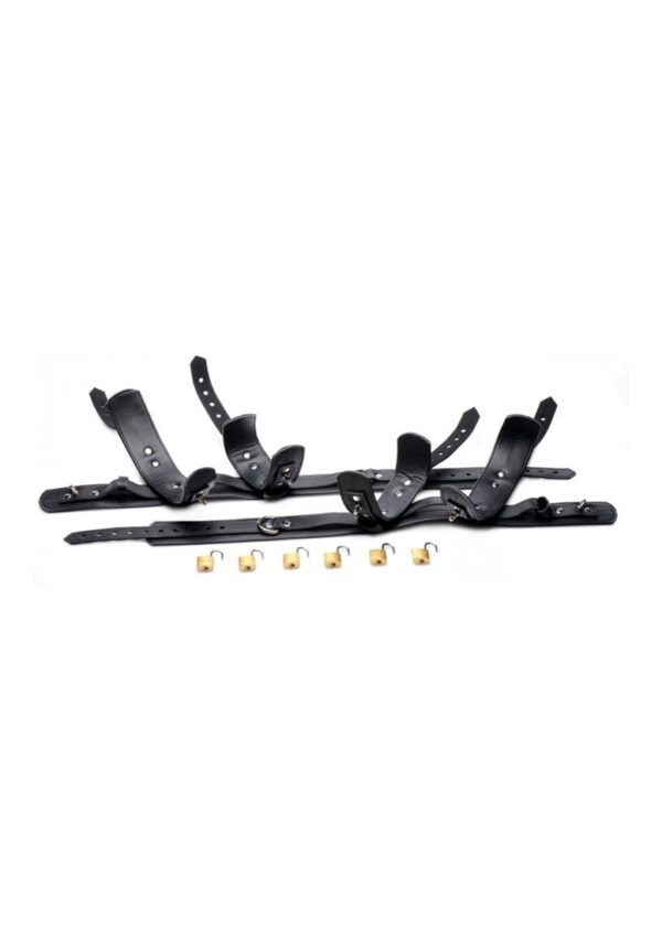 | Omschrijving Beslist | Frog-Tie Restraint Set – Lock together your lovers ankles, wrists, and thighs to get them on their knees and open their body to your whims. Durable and comfortable, suitable for all levels of BDSM players to explore the exciting world of bondage and submission! Adjustable to find the perfect fit and includes all the locks and keys you need to enjoy this Frog Tie set to its fullest.Lock up your partner with the durable locking buckles – this Frog Tie restraint set includes 6 locks and 12 keys for you to restrain your lover! Restrain their ankles to their thighs to force them to their knees, then bind their hands next to have them completely exposed and vulnerable! Combine with other dungeon toys like slappers, floggers, and blindfolds for the ultimate bondage experience.The durable PU leather material is soft and easy on the flesh, allowing you or your subject to resist and pull against these restraints with confidence! The metal buckles are nickel free, easy to use, and easy on your skin for even more comfort while you play.Fully adjustable in every cuff for you to find the perfect fit that suits your playstyle. Get it nice and snug against your partners body for a satisfying tightness their body craves! |
