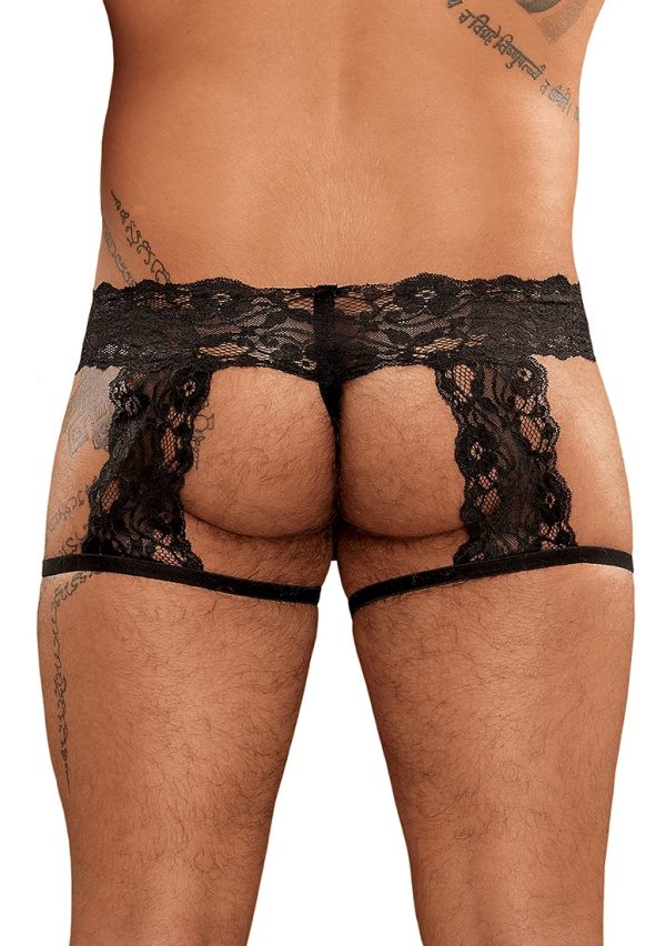 G-String Garter Short – L/XL – BlackDeze stijl uit de Scandal-Lace collectie van Male Power bestaat uit: een korte kousenband met een mesh zakje met cire rand en een dikke tailleband van bloemenkant met bijpassende kousenbanden bevestigd aan zachte elastische beenopeningen en een string op de rug.