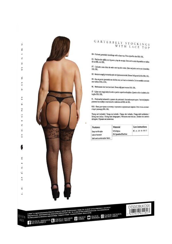 | omschrijving beslist | Garterbelt Stockings with Lace Top – Plus Size Garterbelt Stockings with Lace Top – Plus Size Netkousen met kanten band. Deze stijl past maten 2XL-5XL. String niet inbegrepen. |