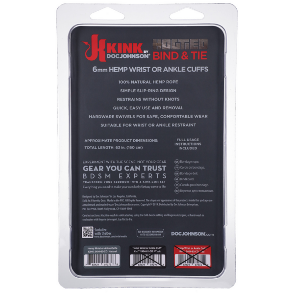 Bind and Tie – Hemp Wrist or Ankle CuffsTouw is het originele hulpmiddel voor bondage en fixatie, en het vinden van het juiste touw voor de klus is essentieel voor veilig en plezierig spelen. Deze zachte manchetten zijn gemaakt van onze Bind Tie 6 mm brede hennep bondagetouwen en zijn een perfecte introductie tot touwspel voor beginners en een snelle manier om altijd en overal bondage te spelen voor meer ervaren gebruikers. Het eenvoudige sleepringontwerp vereist geen tuigage of knopen ervaring, en de lange lus maakt een verscheidenheid aan toepassingen en aanpassingen mogelijk. De zachte, flexibele hennepvezels buigen mee met het lichaam en glijden soepel over de huid voor optimaal comfort en veiligheid van de drager. Kink by Doc Johnson is een opwindende samenwerking met Kink.com om een collectie authentieke fetisj-items van hoge kwaliteit te creeren die geschikt zijn voor zowel langdurige beoefenaars als nieuwe ingewijden.