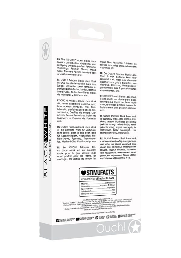 Princess – Lace MaskOUCH! presenteert een serie van 4 handgemaakte, hoogwaardige, lichtgewicht en makkelijk draagbare maskers met moderne details, geinspireerd door Venetie. Vervaardigd met lasersnijtechnologie uit het fijnste, milieuvriendelijke materiaal. Deze maskers voorzien u echt van een vleugje verleidelijke geheimzinnigheid. Twee kwaliteitslinten houden het masker op zijn plaats voor lange uren comfortabel draag- en speelgenot en zorgen ervoor dat het masker makkelijk op maat kan worden gemaakt. De OUCH! Princess Black Lace Mask is een perfecte keus voor sensueel spel, maar ook uitermate geschikt voor galas, bruiloften, modeshows, Carnaval, themafeesten, gemaskerde bals gekostumeerde evenementen, etc.