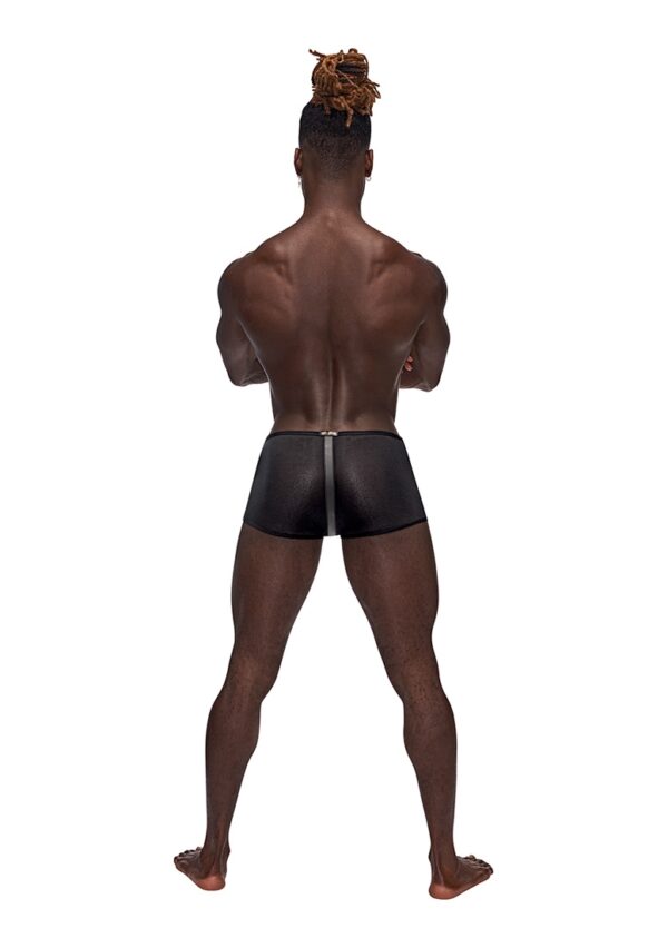 Landing Strip Mini Short – LDe Mini Short uit de Landing Strip-collectie van Male Power heeft een dunne, zachte elastische rand rond de taille en pijpen, een ton sur ton matte onyx-inzetstrook door de zak en de achterkant en een decoratief metalen merklabel op de achterkant van de tailleband.