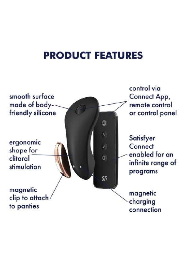Little Secret – Panties Vibrator – BlackProductinformatie Little SecretDankzij de praktische magneet kan Little Secret comfortabel in je slipje worden vastgemaakt en stimuleert het discreet de clitoris met krachtige vibraties. Het siliconen speelgoed is zowel via de app als met de meegeleverde afstandsbediening te bedienen. Satisfyer Little Secret: Pantyvibrator met afstandsbediening en app-bedieningThe Little Secret van Satisfyer is een echte alledaagse held: je bevestigt de clitorisvibrator aan je slipje met een magnetische clip, waardoor hij ideaal is voor sensuele stimulatie onderweg. De pantyvibrator is uitgevoerd in geraffineerd zwart met goudkleurige details en ligt dankzij de ergonomische vorm direct op de clitoris. De krachtige maar fluisterstille trillingen zorgen ervoor dat je Little Secret ook absoluut discreet is. Het heeft een indrukwekkend, zacht oppervlak van lichaamsvriendelijke siliconen dat je een soepele ervaring biedt met slechts een paar druppels glijmiddel. En het plezier hoeft niet te stoppen in de douche of het bad, want de Little Secret heeft een waterdichte (IPX7) afwerking. Geniet van veelzijdig plezier met de Little Secret – bedanktnaar innovatieve app-besturingDe Satisfyer Little Secret is zowel te bedienen via de meegeleverde afstandsbediening als via de gratis Satisfyer Connect App, die beschikbaar is voor Apple en Android. Zo kun je de Little Secret discreet gebruiken in je dagelijks leven of laat je partner het heft in handen nemen. Met de Satisfyer Connect-app kun je ook nieuwe werelden van plezier ontdekken: maak je eigen vibratieprogramma’s op basis van omgevingsgeluiden of je favoriete afspeellijst. De Little Secret is uitgerust met oplaadbare batterijen die eenvoudig kunnen worden opgeladen met de meegeleverde USB-oplaadkabel.