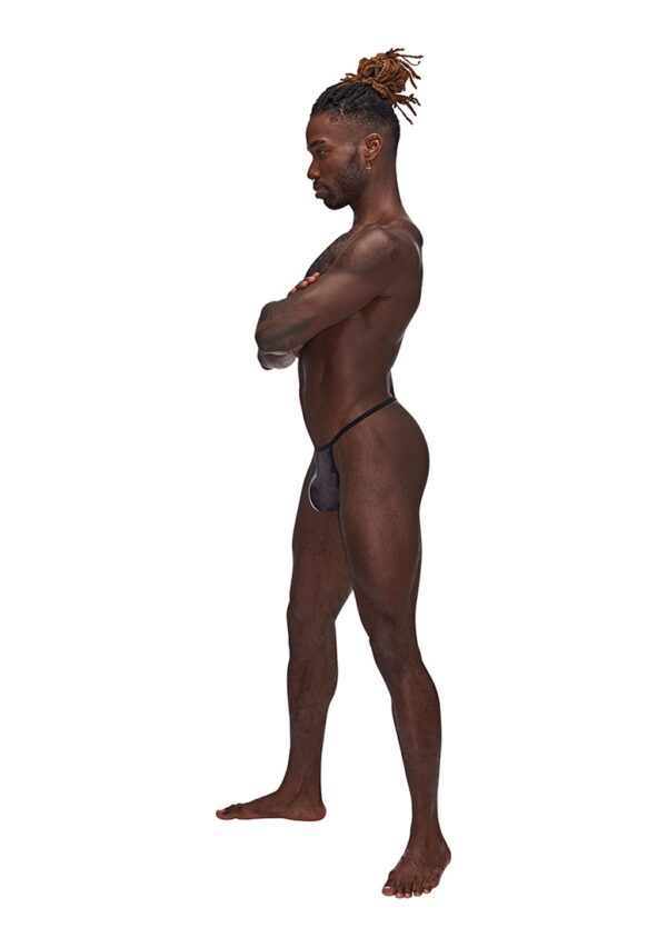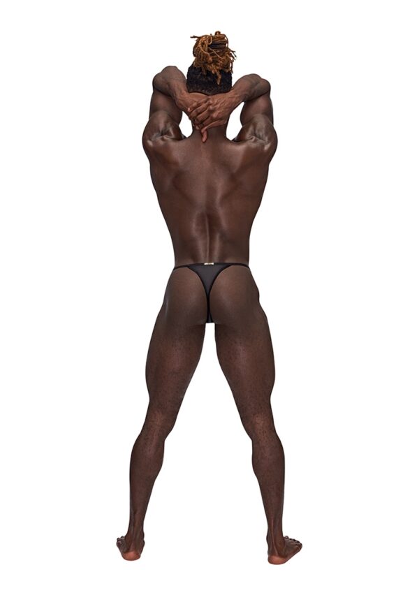 Landing Strip Micro Thong – S/MDe Micro Thong uit de Landing Strip-collectie van Male Power heeft een dunne, zachte, elastische tailleband, een ton-sur-ton matte onyx-inzetstrook door het zakje en een decoratief metalen merklabel op de achterkant van de tailleband.