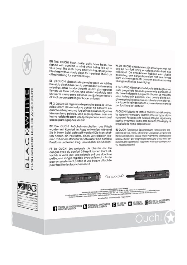 Plush Bonded Leather Ankle CuffsDe OUCH!- enkelboeien zijn ontworpenmet het oog op comfortterwijl je vastgebonden bent in jerollenspel! De enkelboeien hebbeneen pluche bekleding, een aanpasbareriem met een stevige klem vooreen perfecte pasvorm en een extraring voor gemakkelijke bevestiging!