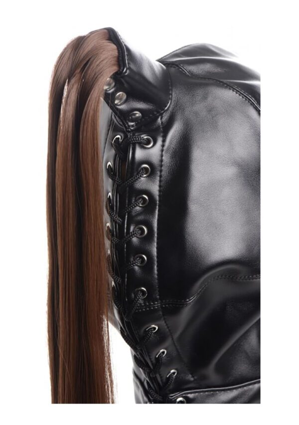 | Omschrijving Beslist | Ponytail Bondage Hood – Black – Fulfill your fetish fantasies with this soft leather hood that hides the face while keeping eja, nose and mouth free! A long brown wig is attached to the top of the hood for an enchanting effect. This hair can also be used for sensation play the same way youd use a feather tickler. |