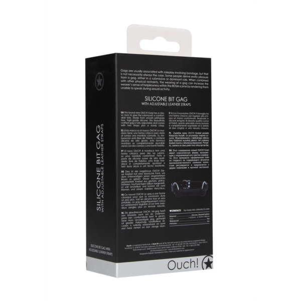 Bit GagDe gloednieuwe OUCH!- bit-gag heefteen klassieke vorm om de onderworpeneeen comfortabele beet te geven.Deze mooi vervaardigde gag, gemaaktuit gladde, ftalaatvrije, kwalitatieve siliconen,is volledig aanpasbaar en komtmet twee riemen en een stevige klem.