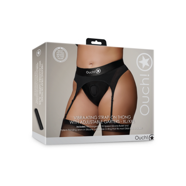 Vibrating Strap-on Thong with Adjustable Garters – XL/XXL – BlackDe vibrerende strap-on boxer heeft een elegant design, met een langer broekspijpje. Simpel en elegant, deze strap-on onderbroekjes zijn perfect voor jou en je partner. Maak je geen zorgen over gecompliceerde bandjes en klipjes, trek het broekje aan, voeg een toy toe en geniet. Met een groot aantal verschillende stijlen, vormen en maten, is er voor iedereen de perfecte pasvorm. Door het unieke O-ring systeem, passen bijna alle dildos in de strap-on broekjes, zonder hulp van extra O-ringen. Bij elk broekje zit een premium kwaliteit, silicone, her-oplaadbare, 10-functie vibrerende bullet voor extra sensaties voor jou en je partner. Het broekje is gemaakt van hoogwaardig elastisch compressiemateriaal voor een betere pasvorm, comfort en gebruikersduur. De lichtgewicht ademende stof zal vocht van het lichaam afvoeren en ervoor zorgen dat je koel blijft, when things get hot. Perfect voor packing, peggen en penetratie. Verkrijgbaar in de maten XSS, ML, XLXXL. 1 jaar garantie. Past perfect bij alle Ouch! RealRock Dildos Dongs.