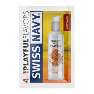 4 in 1 Lubricant with Salted Caramel Delight – 0.18 fl oz / 5 mlOnze Swiss Navy Flavors smaken zo echt dat ze te lekker lijken om glijmiddel te zijn. We hebben