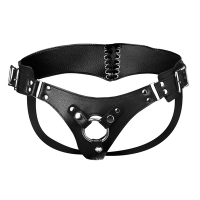 Leather Corset Back Strap On Dildo Harness – Black