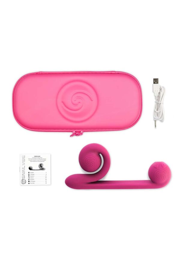 Snail Vibe – Flexible Vibrator – PinkDe vibrerende kracht van een massagestick, de inbrengdiepte van een dildo en de dubbele stimulatie van een rabbit vibrator. De Snail Vibe is een veelzijdig seksspeeltje dat je alleen of met een partner kunt gebruiken. Voor een klassieke vibratorervaring houd je de flexibele clitorisstimulator vast of pas je de intense vibraties extern toe op de clitoris of een ander lichaamsdeel waar massage gewenst is. De multifunctionele vibrator heeft 2 krachtige onafhankelijke motoren, 1 voor clitorisstimulatie in de spiraalkop en 1 voor innerlijk genot aan de punt van de schacht. In tegenstelling tot traditionele rabbit vibrators zorgt het revolutionaire gepatenteerde spiraalkopontwerp van de Snail Vibe ervoor dat de clitorisstimulator een continue verbinding behoudt tijdens het gebruik. INBEGREPEN IN DE DOOS – Snail Vibe, beschermhoes, oplaadkabel, handleiding.