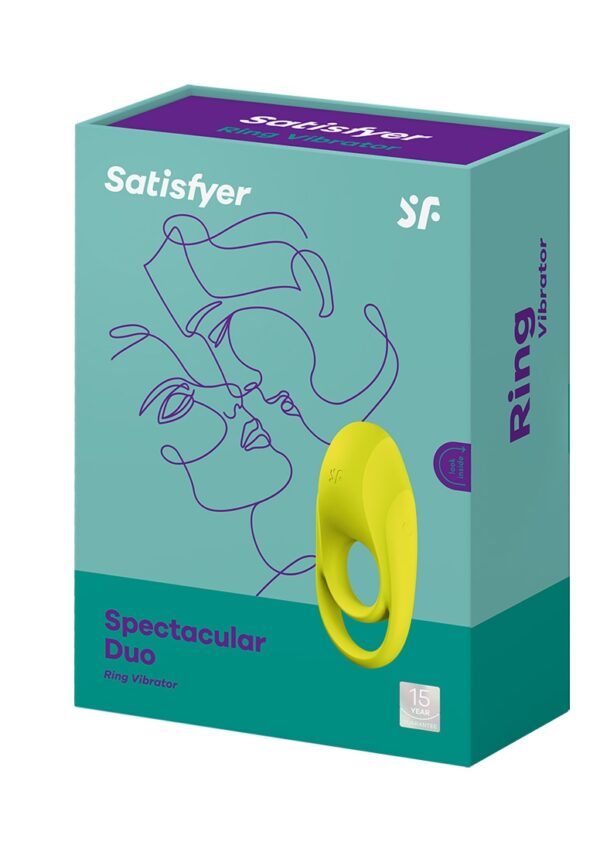 Spectacular – Double Strap Vibrating Cockring – Neon GreenBereid je voor op spectaculaire momenten van plezier: de Satisfyer Spectacular Duo is een hoogwaardige siliconen cockring met kogelring, die zorgt voor meer intensiteit tijdens het vrijen en tegelijkertijd je uithoudingsvermogen verbetert. De binnenring omsluit je penis en de buitenste balring omsluit je testikels voor een opwindend beperkend effect op je bloedstroom. Ondertussen wordt ook je partner liefdevol verzorgd door de clitorisstimulator aan de vibrerende cockring – dankzij zijn volumineuze vorm biedt hij bijzonder uitgebreide stimulatie. De 12 vibratiestanden zijn eenvoudig te bedienen met de one-touch-knop aan de zijkant.