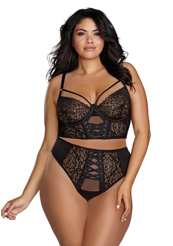 Stretch Mesh and Stretch Galloon Lace Bustier – 1XStretch mesh en stretch galloon kant bustier. Baleinen aan de voorkant. Veterdetail met doorschijnende mesh achterkant. Zilveren ringen en ringen. Verstelbare bandjes. Haak-en-oog sluiting op de rug met 3 verstelmogelijkheden. Bijpassende stretch mesh en stretch galloon veter string panty