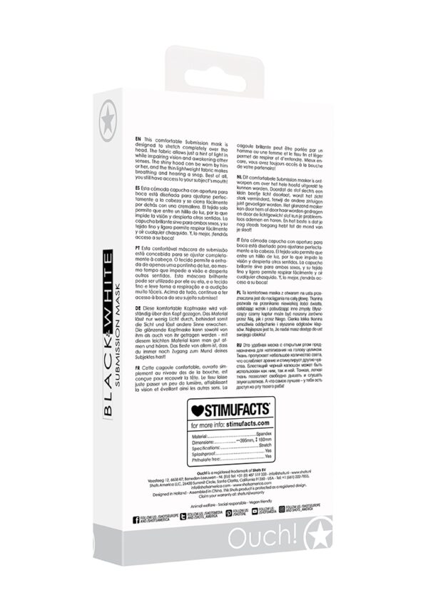 Submission MaskDit comfortabele Submission masker is ontworpen om over het hele hoofd uitgerekt te kunnen worden. Doordat de stof slechts een klein beetje licht door- laat, wordt het zicht sterk verminderd, terwijl de an- dere zintuigen juist gevoeliger worden. Het glanzend masker kan door hem of door haar worden gedra- gen en door de lichtgewicht stof kun je probleemloos ademen en horen. En het beste is dat je nog steeds toegang hebt tot de mond van je slaaf!