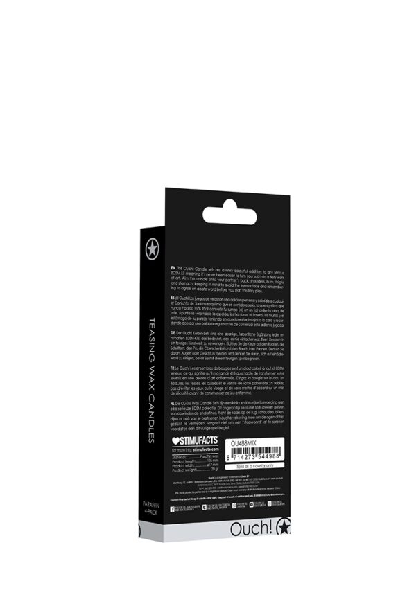 Teasing Wax Candles – 4 Pieces – MulticolorDe Ouch! Wax Candle Sets zijn een kinky en kleurrijke toevoeging aan elke serieuze BDSM collectie. Dit ongelooflijk sensuele spel creeert golven van opwindende endorfines. Richt de kaars op de rug, schouders, billen, dijen of buik van je partner en houdt er rekening mee om de ogen of het gezicht te vermijden. Vergeet niet om een stopwoord af te spreken voordat je aan dit vurige spel begint